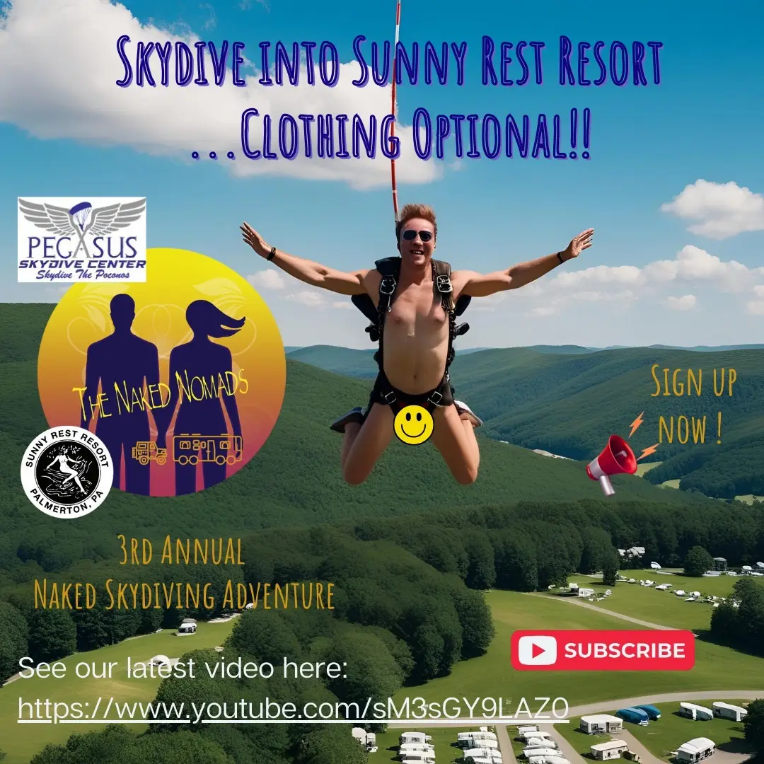 Its confirmed! Join The Naked Nomads & Pegasus Skydive Center for the 3rd Annual Naked Skydive Adventure at Sunny Rest Resort during Nude Recreation Week…